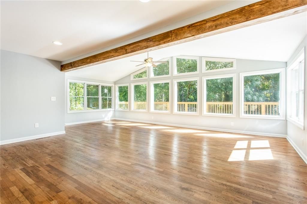 Spacious living room with large windows, white sofa, two black chairs, wooden coffee table on an ornate rug, and a stone fireplace. Wood beams and hardwood floors add warmth to the bright space.